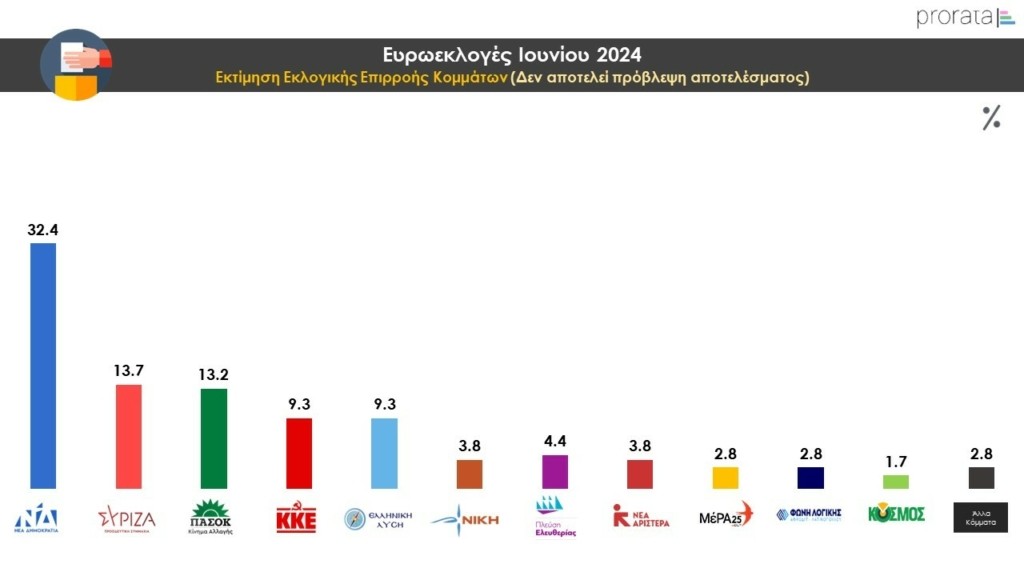 Στη βάση των παραπάνω ορίων, η κεντρική τιμή της εκτίμησης για τη Νέα Δημοκρατία είναι 32.4%, για τον ΣΥΡΙΖΑ-ΠΣ 13.7%, για το ΠΑΣΟΚ-ΚΙΝΑΛ 13.2%, το ΚΚΕ και την Ελληνική Λύση 9.3%, τη Νίκη 3.8%, τη Νέα Αριστερά 3.8%, το ΜεΡΑ25 και τη Φωνή Λογικής 2.8%, ενώ για ο Κόσμος 1.7%.