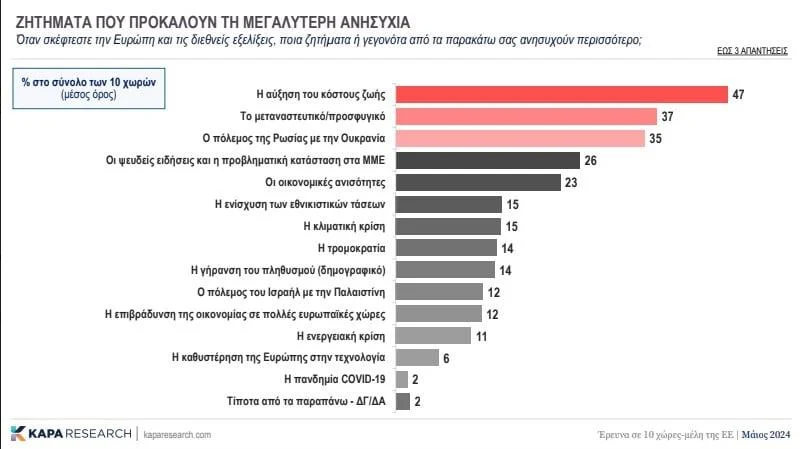 Η αύξηση του κόστους ζωής είναι η κύρια ανησυχία για τους Έλληνες (55 %), ακολουθούμενη από το μεταναστευτικό/προσφυγικό (34%) και τις οικονομικές ανισότητες (32%).