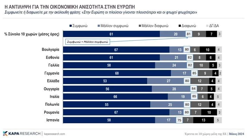 Την ίδια ώρα, περισσότεροι από οκτώ στους 10 (81% συνολικά) θεωρούν ότι «στην Ευρώπη οι πλούσιοι γίνονται πλουσιότεροι και οι φτωχοί φτωχότεροι».