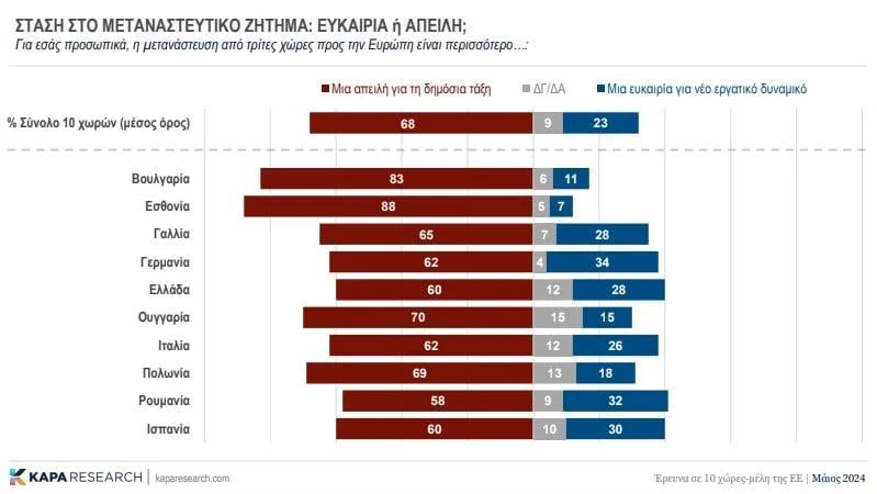 Την ίδια ώρα το 60% των Ελλήνων θεωρεί ότι μετανάστευση από τρίτες χώρες προς την Ευρώπη είναι περισσότερο μια «απειλή για τη δημόσια τάξη»