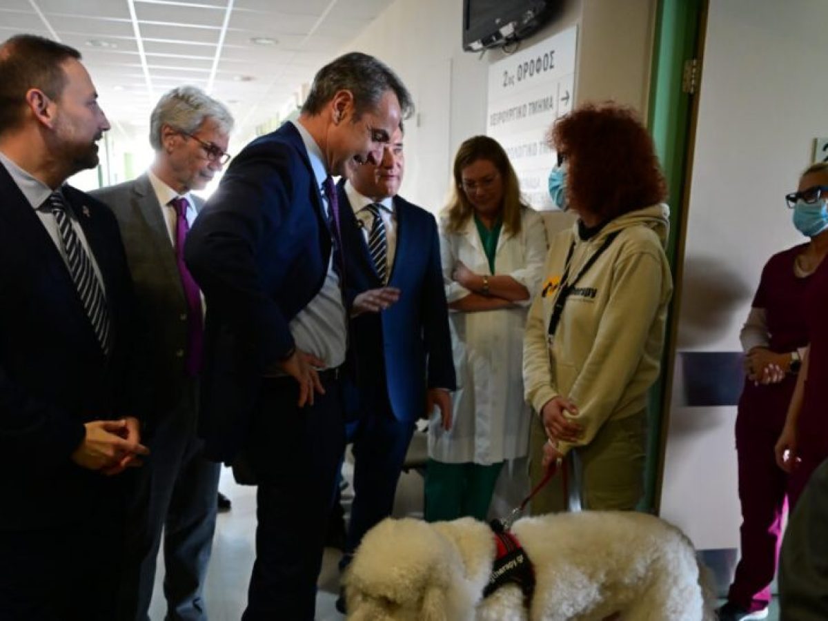 Μια ιδιαίτερη στιγμή επιφύλασσε η επίσκεψη του πρωθυπουργού Κυριάκου Μητσοτάκη στο Γενικό Αντικαρκινικό Νοσοκομείο Πειραιά «Μεταξά», όπου είχε την ευκαιρία να γνωρίσει από κοντά έναν σκύλο θεραπείας που συμμετέχει στο πρόγραμμα «Παρέα με Ουρά». Πρόκειται για μια πρωτοβουλία ψυχολογικής υποστήριξης ογκολογικών ασθενών, η οποία εφαρμόζεται πιλοτικά στο νοσοκομείο από τον Απρίλιο του 2025, με τη συνδρομή εθελοντών και ειδικά εκπαιδευμένων σκύλων. Η επίσκεψη του Κυριάκου Μητσοτάκη πραγματοποιήθηκε στο πλαίσιο της υπογραφής μνημονίου συνεργασίας ανάμεσα στο υπουργείο Υγείας και την Allwyn για τη δωρεά που αφορά την πλήρη ανακαίνιση του νοσοκομείου. Συνοδευόμενος από τον υπουργό Υγείας Αδωνι Γεωργιάδη, τον υφυπουργό Μάριο Θεμιστοκλέους και στελέχη της εταιρείας, ξεναγήθηκε από τη διοίκηση του νοσοκομείου και ενημερώθηκε τόσο για τις αλλαγές που δρομολογούνται στις υποδομές όσο και για τις παρεμβάσεις που ενισχύουν την καθημερινότητα των ασθενών.