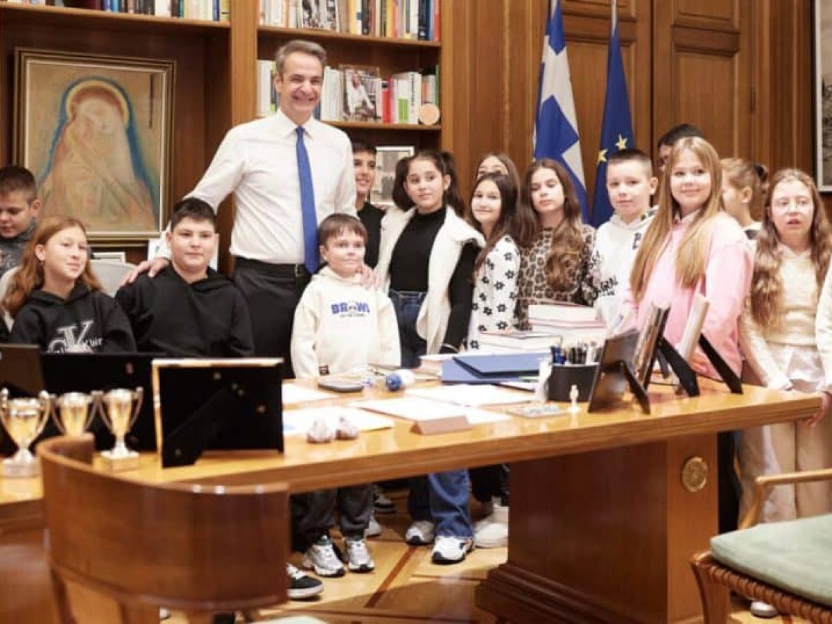 Ο Κυριάκος Μητσοτάκης τους ξενάγησε στο γραφείο του και τους προσέφερε αναμνηστικά δώρα.