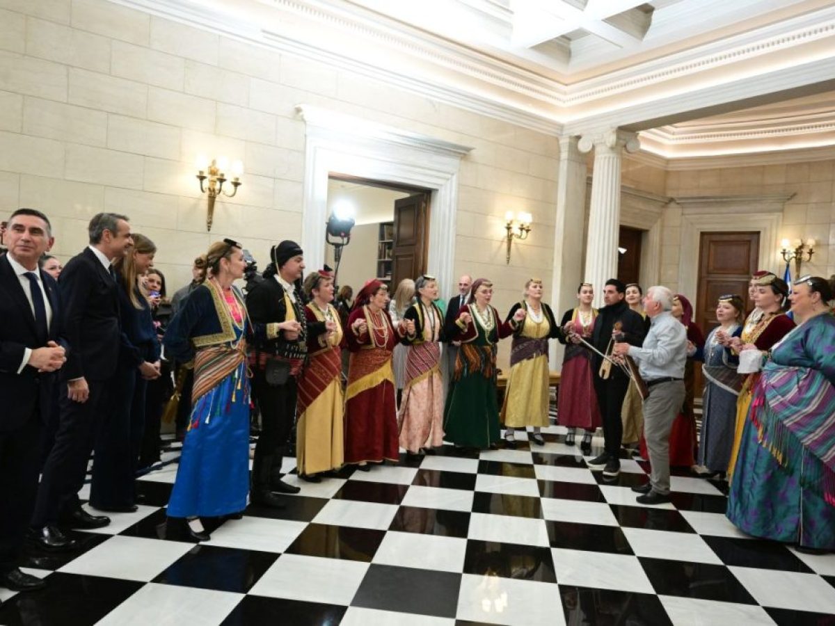 Η Ένωση Λιοσιωτών Ιλίου είπε τα κάλαντα την παραμονή Πρωτοχρονιάς στον πρωθυπουργό Κυριάκο Μητσοτάκη στο Μέγαρο Μαξίμου, με παραδοσιακές στολές και χαμόγελα.